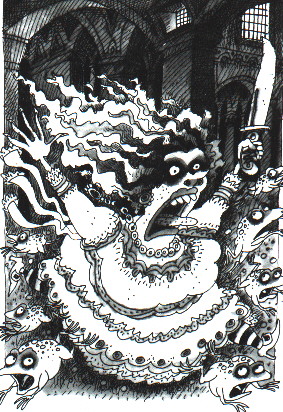 Eufemia C'era un paiolo gigantesco di rane bollite, una delizia ! Le divoravo ossa e tutto per paura che qualcun'altro me le portasse via. Che mangiata incredibile! Ero cosė disperata! Verso la sessantesima rana ho avvertito un peso tremendo allo stomaco, poi tutto il mondo si č messo a girare vorticosamente ed č scesa la notte sui miei occhi... |
