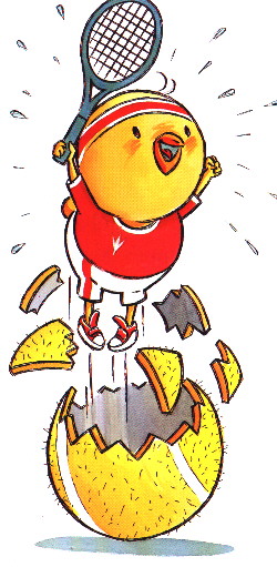 | in quel momento la pallina da tennis si apre e compare davanti agli occhi sbalorditi di Elvira, dei suoi figli e del ragno Nicola, il pulcino pił strano che essi abbiano mai visto : indossa calzoncini e maglietta "POLLO-SPORT", scarpe "CHICCHIRICHI'", polsino e fascia per il sudore "TACCHINI"; in mano regge con grande disinvoltura un modernissimo racchettone in fibra di carbonio... |
